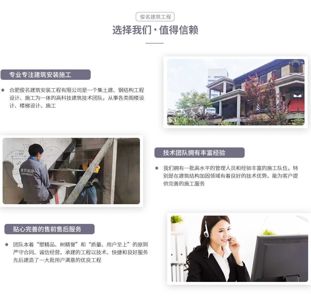 - 合肥俊名建筑安裝工程有限公司是一個集土建、鋼結(jié)構(gòu)工程設(shè)計、施工為一體的高科技建筑技術(shù)團隊,從事各類閣樓設(shè)計、施工。我們擁有一批高水平的管理人員和經(jīng)驗豐富的施工隊伍,特別是在建筑結(jié)構(gòu)加固領(lǐng)域有著良好的技術(shù)優(yōu)勢。團隊員工精誠團結(jié),以“尊重規(guī)范,拒絕平凡”為宗旨,為客戶提供完善的施工服務。團隊本著“塑精品、樹精譽”和“質(zhì)量、用戶至上”的原則,嚴守合同、誠信經(jīng)營,所...